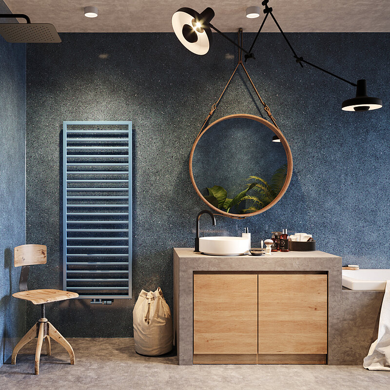 Drsné, přírodní povrchy kontrastují s rafinovaným designem. Hrubé betonové textury v kombinaci s leštěnými kamennými povrchy poskytují našim smyslům nevšední zážitek. Černá, rozmanité odstíny šedé a barva grafitu jsou klíčem k mystickému domovu. Jednobarevné místnosti jsou zvýrazněny tmavě modrými tóny a broušeným kovem. Paleta tlumených barev je určena pro klidný prostor, pro osobní rituály a wellness.