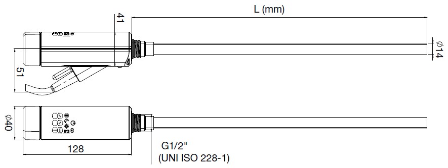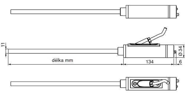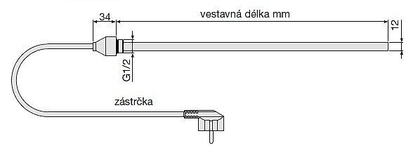 Elektrická topná tyč DBM s tělesem Ø 35 mm, délky 130 mm, s ochranou proti stříkající vodě IP 44, označením CE, pro připojení do el. sítě 230 V ± 10 %.