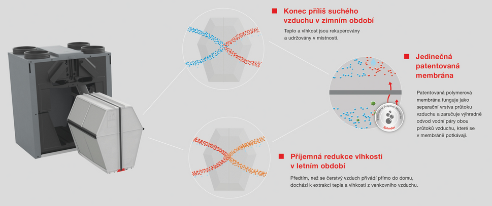 V chladných zimních dnech bývá vzduch v místnostech často příliš suchý. V horkých teplých dnech můžete mít pocit, že teplý a vlhký vzduch je teplejší, než ve skutečnosti je. To může vést k nepříjemnému podráždění. Abychom se cítili příjemně, potřebujeme čerstvý vzduch s relativní vlhkostí v rozsahu 40 % až 60 %. Jak toho dosáhnout a k tomu ušetřit náklady na instalaci i vytápění? Nabízíme řešení, entalpický výměník Zehnder.