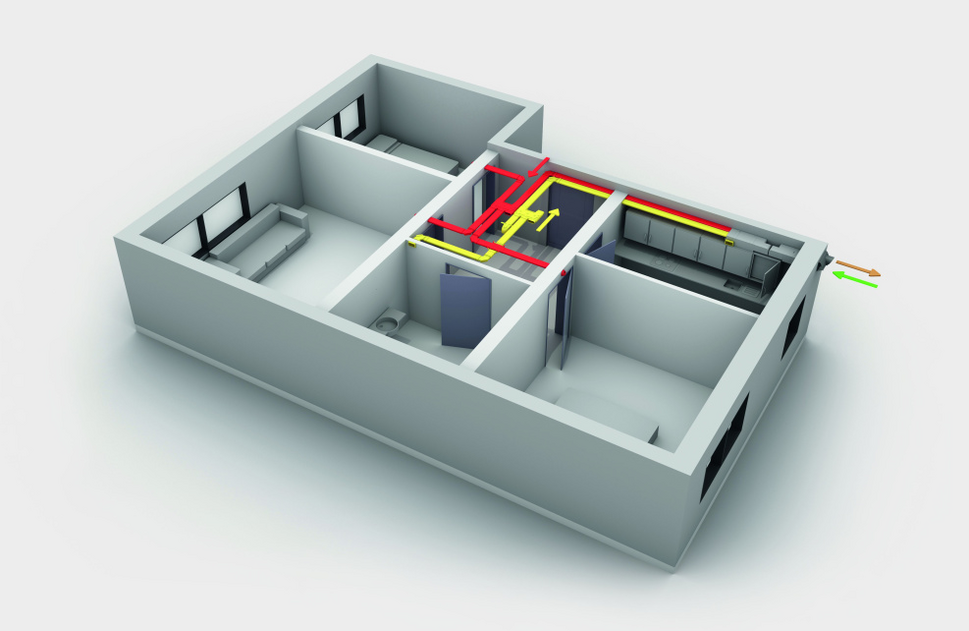 Kompaktní systém větrání s rekuperací tepla funguje jako tzv. semicentrální systém větrání s větrací jednotkou umístěnou kdekoliv v bytě a s rozvody vedenými pod stropem do jednotlivých místností. Viditelnými prvky v interiéru pak jsou pouze designové mřížky a ventily pro přiváděný a odváděný vzduch.