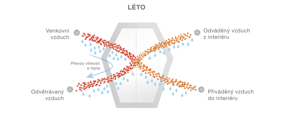 V létě relativně vlhký vzduch cítíme jako teplejší, než ve skutečnosti je. Proto dochází k odvodu tepla a vlhkosti z teplého a vlhkého venkovního vzduchu dříve, než je čerstvý vzduch přiveden do domu. Systémy komfortního větrání Zehnder s volitelným integrovaným entalpickým výměníkem vytvářejí během léta ideální vnitřní klima.
