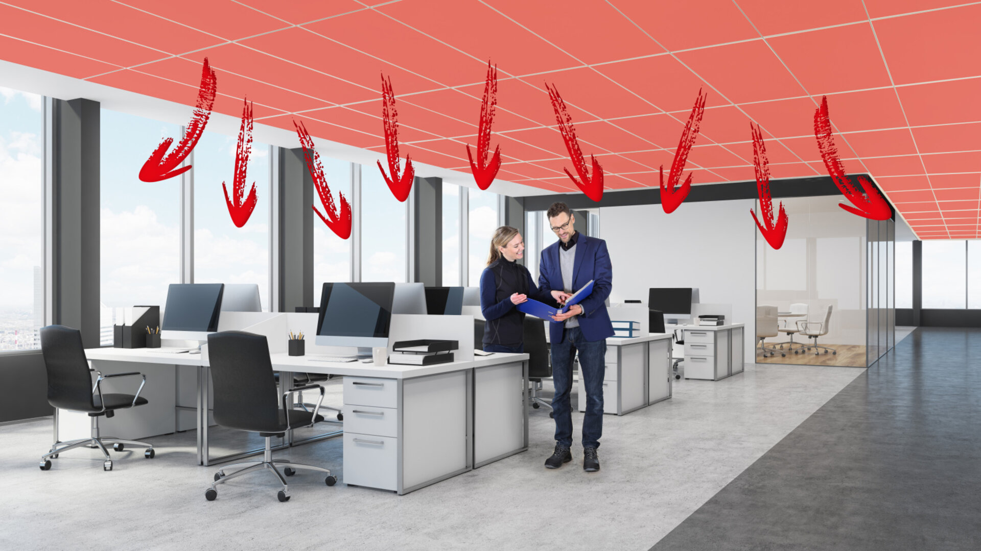Nenákladný a účinný způsob vytápění budov lze využít také k chlazení: studená voda protéká chladicími stropními panely. Osoby a předměty v místnosti vyzařují díky své vyšší teplotě teplo do stropu. Zároveň stoupá teplý vzduch nahoru ke stropu a předává teplo chladicím stropním panelům. Ochlazený vzduch proudí zpět do místnosti.