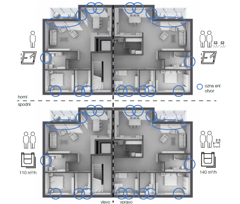 Dva byty jsou větrány manuálně okny, další dva byty jsou vybaveny řízeným větráním s rekuperací tepla Zehnder.