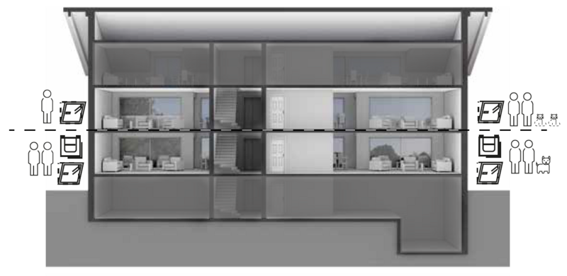 Pro větší srozumitelnost označujeme v následujících odstavcích byty v prvním patře jako „spodní byty“ a byty ve druhém patře jako „horní byty“.