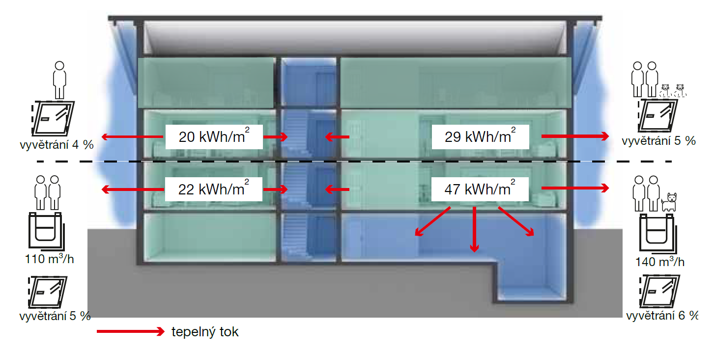 Na obrázku 6 porovnáváme celkovou spotřebu na vytápění 22 kWh/m2 spodního levého bytu a 29 kWh/ m2 horního pravého bytu se stejným využíváním oken (stejný faktor vyvětrání 5 %). Vidíme,že přidání vyváženého větracího systému nevede k vyšší spotřebě energie na vytápění; spotřeba je ve skutečnosti o 24 % nižší.
