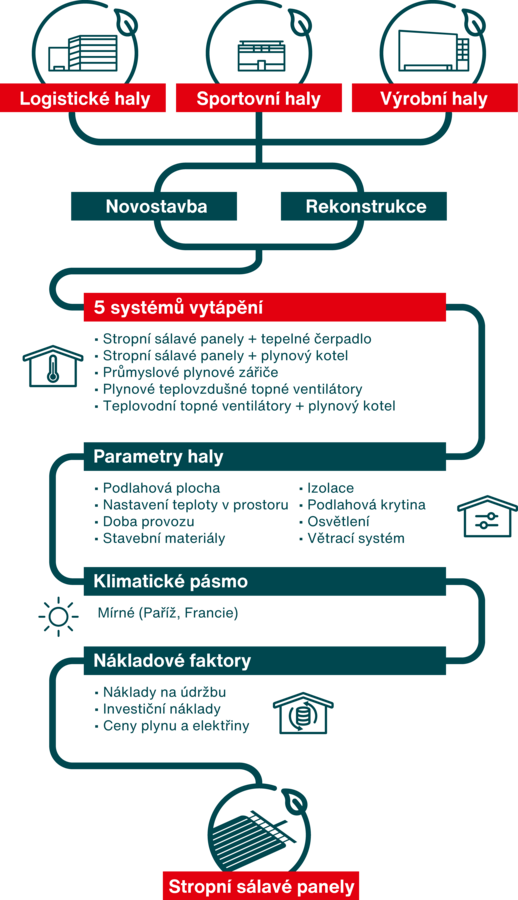 Na trhu existuje mnoho řešení vytápění velkých hal. Které z nich je však nejlepší? Jak ukazuje nedávná studie společnosti Tribu Energie, volbou správného nosiče tepla lze dosáhnout značných úspor energie a nákladů - a to i v případě, že zdroj tepla zůstane nezměněn. Například přechodem z teplovodních topných ventilátorů na stropní sálavé panely lze snížit spotřebu energie až o 30 %, přestože bude stále používán stejný plynový kotel. V kombinaci s tepelnými čerpadly je možné dosáhnout úspory až 70 %.